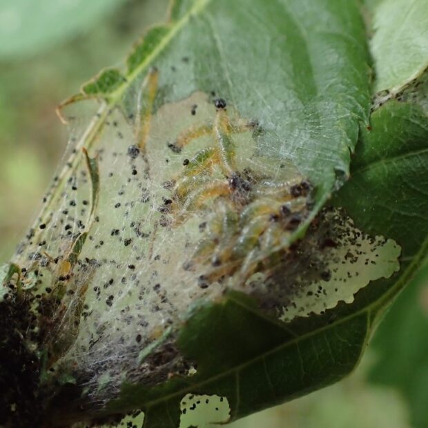 • 幼虫は集団で糸を出して天幕を作り、 葉を食べる。