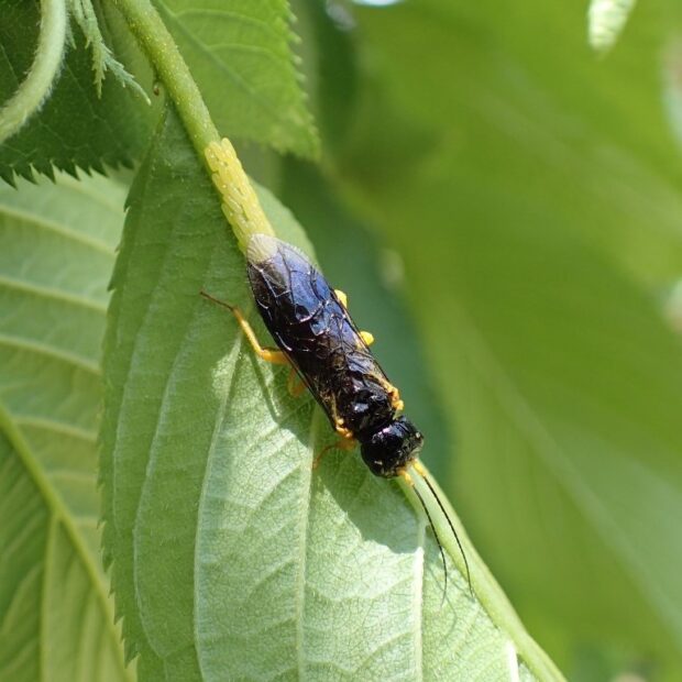 サクラなどで見られるヒラタハバチの仲間。 体は扁平で黒く、 あしや触角のつけねは黄色。 卵は黄色く、 葉裏の主脈に20~30個産みつけられます。 幼虫は、 6~7月、 サクラ類に集団で糸を張り、 葉を食べます。
