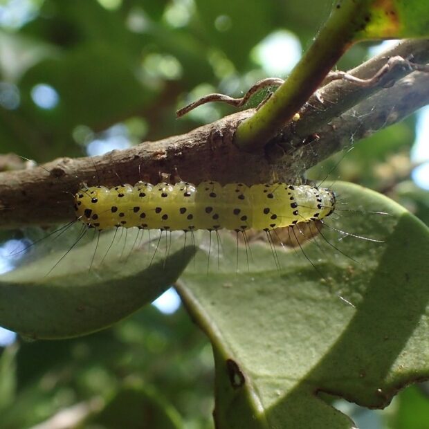 縦の黒い線が目立つ暖地性のガ。 幼虫は、 黄緑色で長い毛がはえおり、 蛹になる前に赤っぽくなります。 庭のシマトネリコやオリーブにもやってきます。