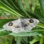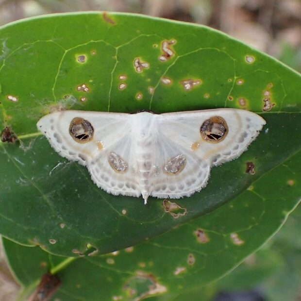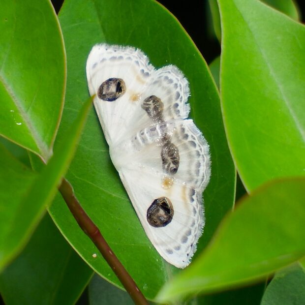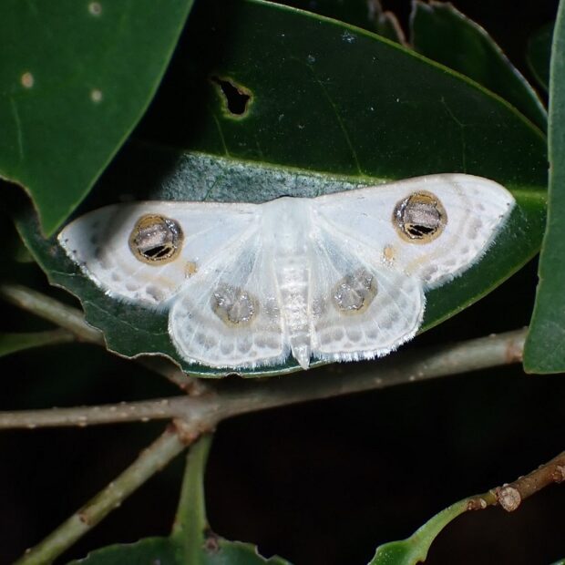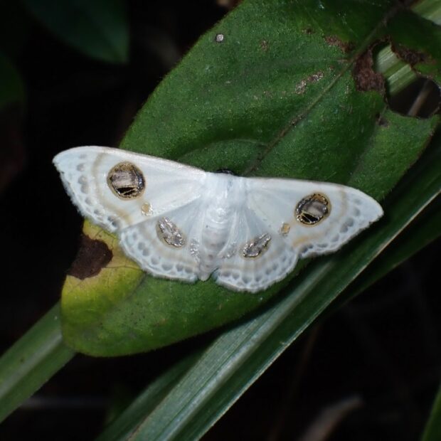 南方系のエダシャクの仲間。 大きな目玉模様が特徴的な白いヒメシャク。 はねには銀色に光る部分があり、 美しいです。 幼虫はシャクトリムシ。
