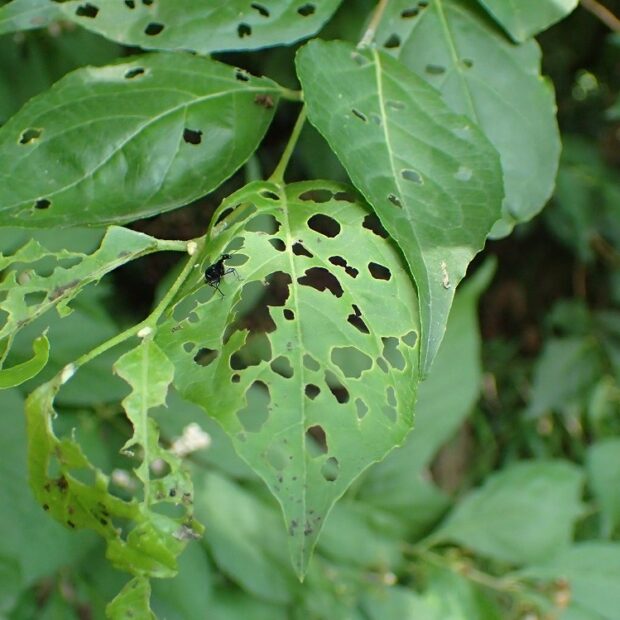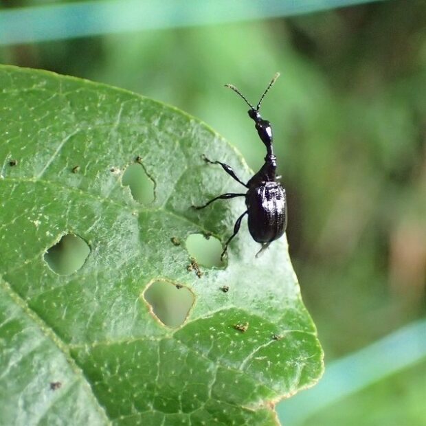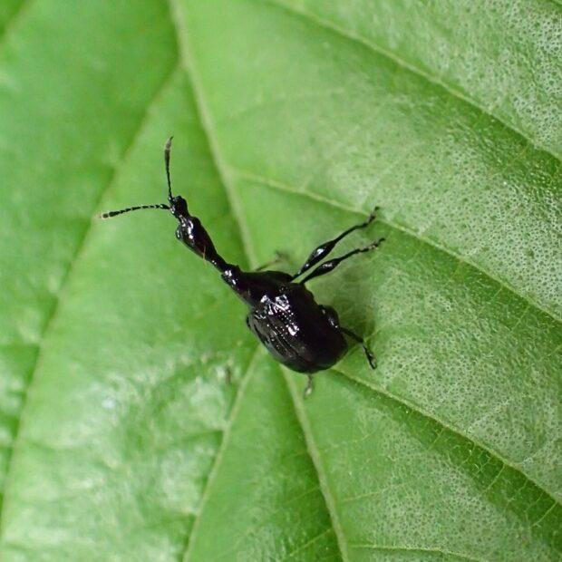 エゴノキで普通に見られる、 光沢のある真っ黒なオトシブミ。 エゴノキの葉を食べ、 オスがツルのように首(頭部)が長いことから「ツルクビ」と名づけられました。 ただし小型のオスは、 首がそれほど長くありません。