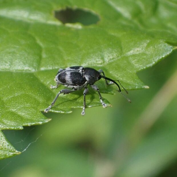 エゴノキで見られ、 花にもやって来る口吻(こうふん=細長く伸びた口の器官)が長いシギゾウムシ。 口が鳥のシギのくちばしのように長いので、 シギゾウムシと名づけられました。 メスはエゴノキの実に産卵し、 幼虫は実の中で育ちます。