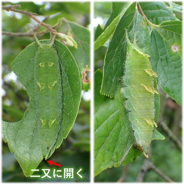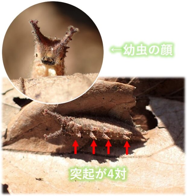 • 4齢幼虫。 エノキの落ち葉の裏で越冬。 越冬幼虫は枯れ葉色。 4対の突起がある。