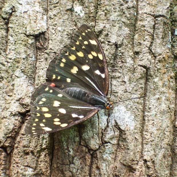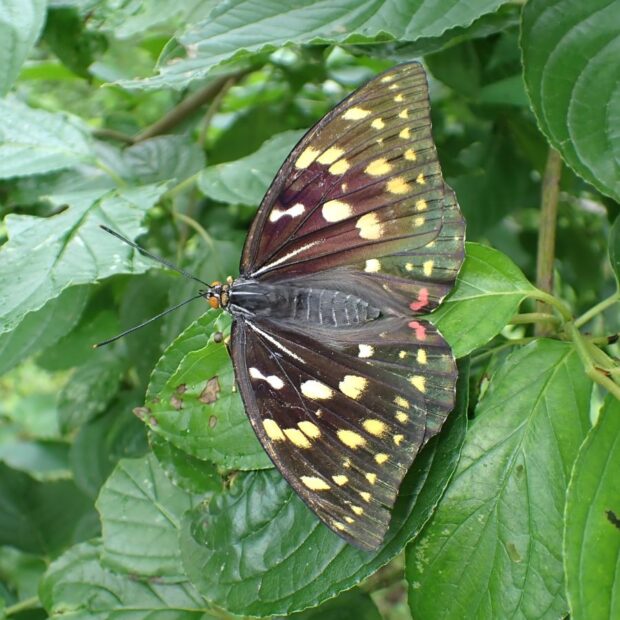 日本の国蝶で、 雑木林を代表するチョウ。 オスは鮮やかな青紫色で、 メスはこげ茶色。 力強く羽ばたき、 オスは縄張りをもちます。 樹液によくやってきます。 良好な里山環境が少なくなり減少しています。