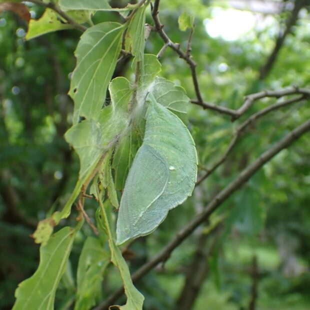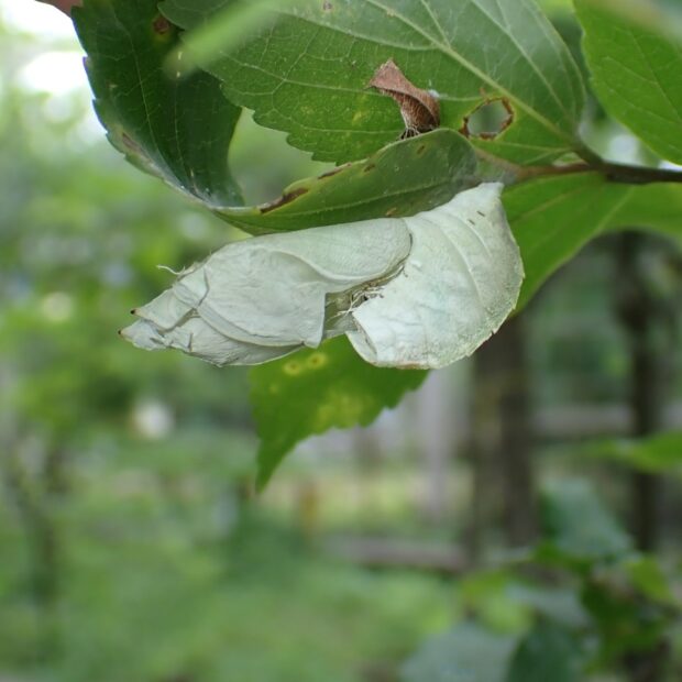 葉の表面に糸で固定し静止している。