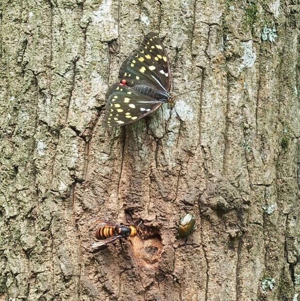 • メスが、 エノキの枯れた枝に産卵している。