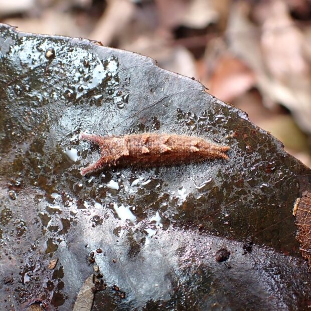 • 越冬幼虫。 エノキの根元に積もる枯れ葉をめくると見つかる。