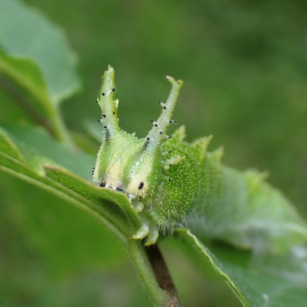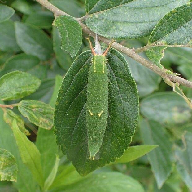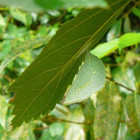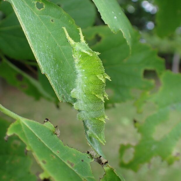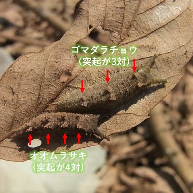 • 幼虫はエノキの根もとの落葉の裏で越冬。 ゴマダラチョウとオオムラサキの幼虫が仲良く同じ葉に。