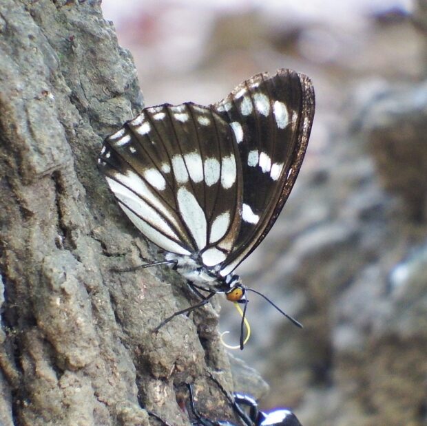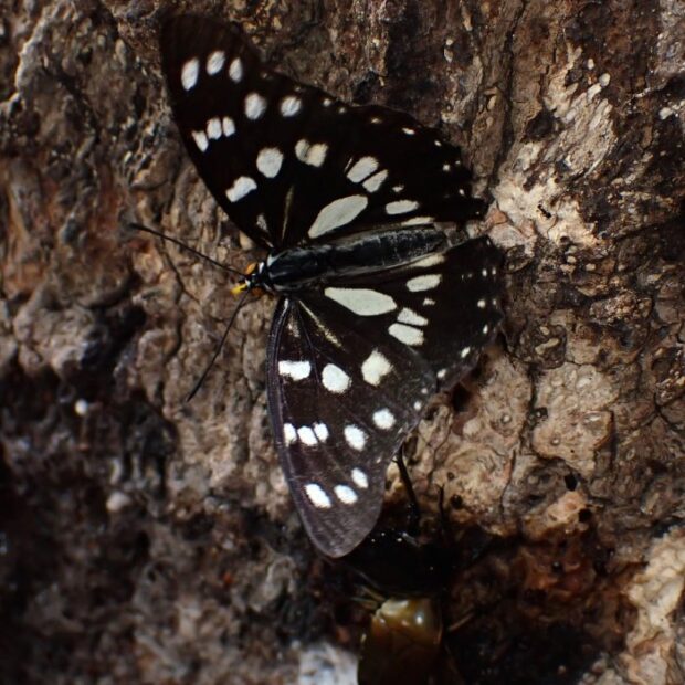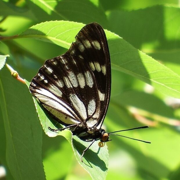 黒いはねに白い模様があるタテハチョウの仲間。 春にあらわれるゴマダラチョウは白っぽく、 夏以降は黒っぽくなります。 花に来ることはなく、 樹液に集まり、 地面で給水もします。 街中の公園でも見られることがあります。