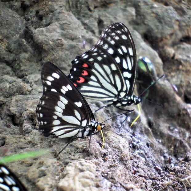 • ゴマダラチョウ(左前)とアカボシゴマダラ(右奥)が仲良く樹液を吸っている。
