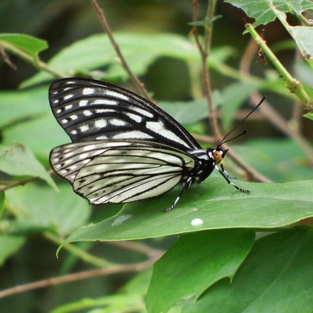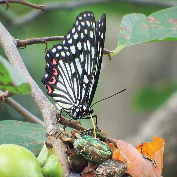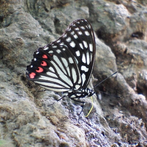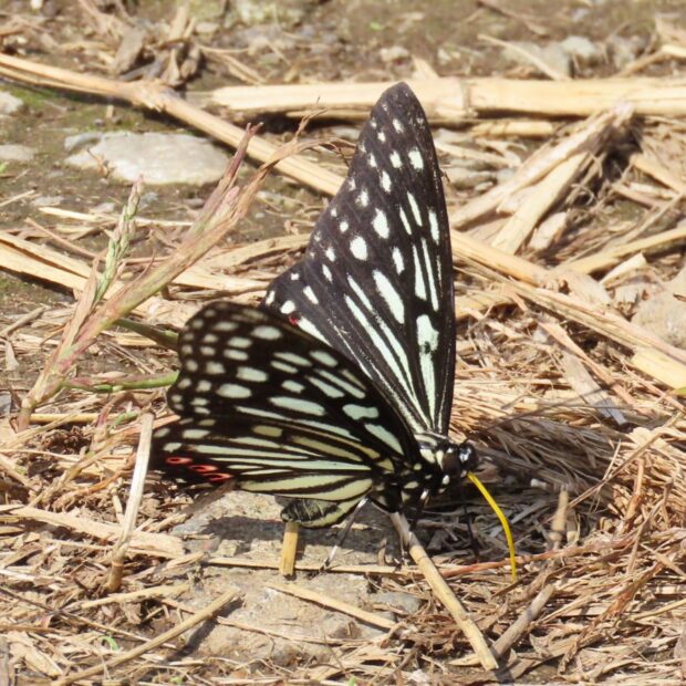 はねは黒地に白い紋があり、 後ろばねに赤い紋があります。 春にあらわれる春型は、 赤い紋がないものが多く、 全体に白っぽく見えます。 奄美諸島以外のものは中国から持ち込まれた外来種。 関東地方から各地に拡大しています。