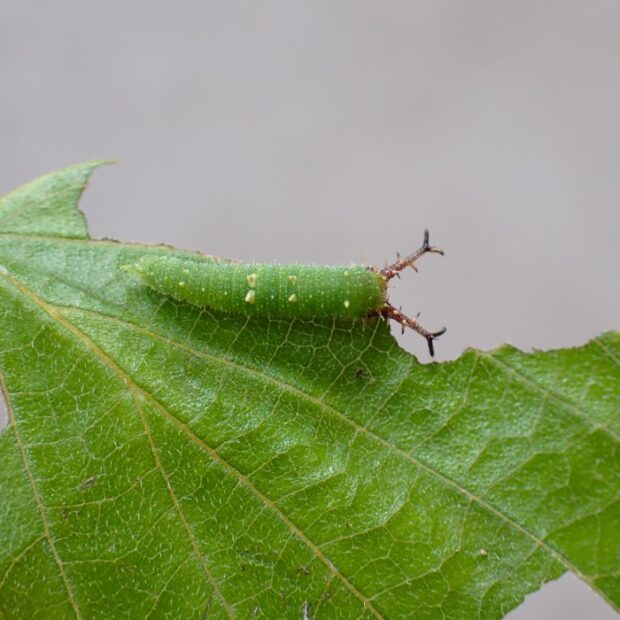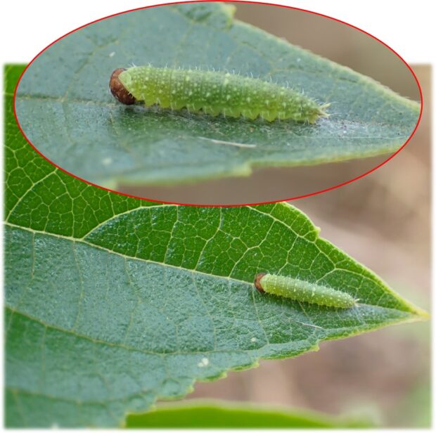 • 初齢幼虫(約4mm)。 エノキの葉の付け根の方に頭を向けている。 初齢幼虫は頭にツノがなく、 2齢になるとツノがある。
