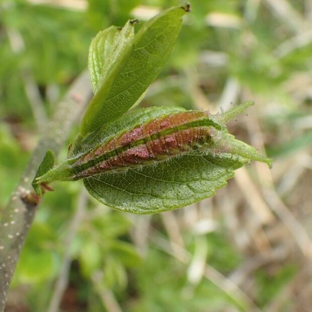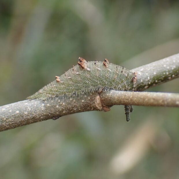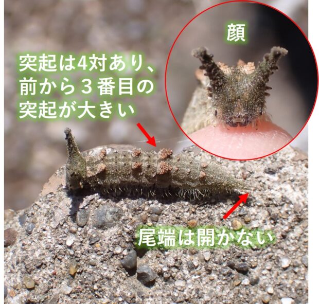 • 幼虫。 背中の突起は4対あり、 お尻の突起はくっつく。