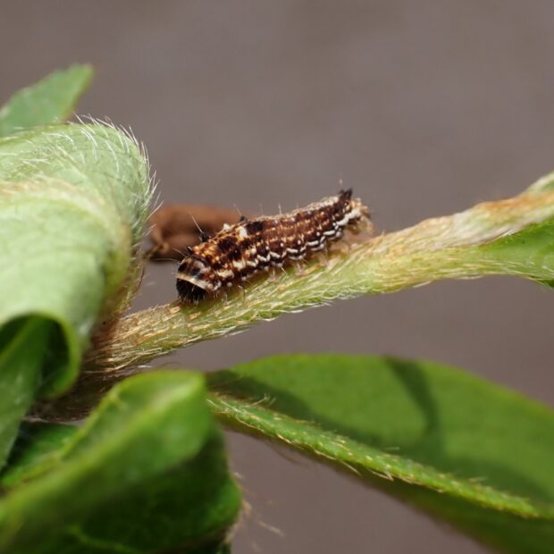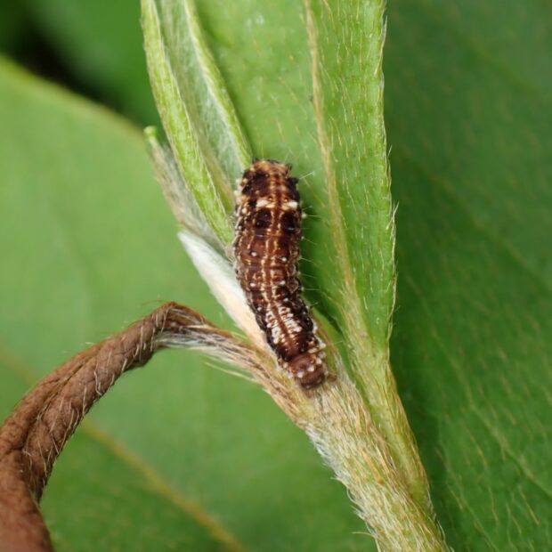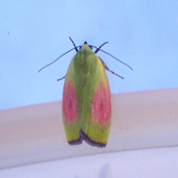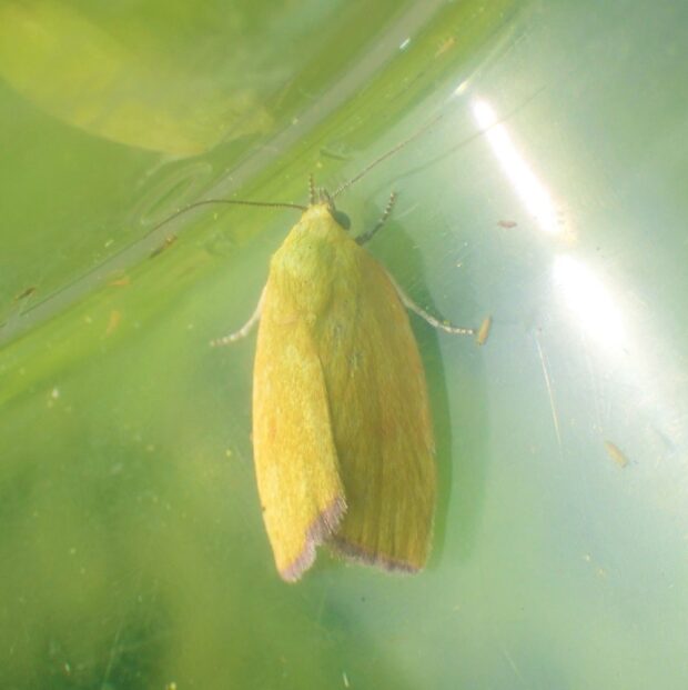 コブガの仲間。 黄色いはねにピンクの紋がかわいい小さなガです。 黄色一色でピンクの紋がないものもいます。 幼虫はツツジの芽や葉を食べます。