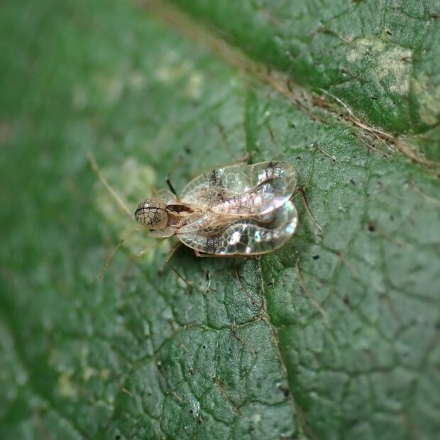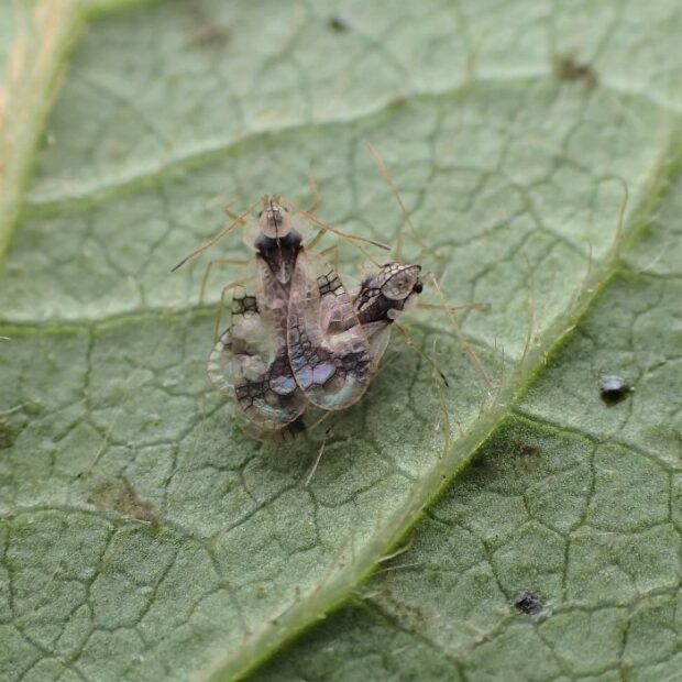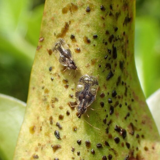 ツツジの葉の裏につく小さなグンバイムシ。 グンバイムシはカメムシの仲間で、 はねが大きく広がって軍配のようになっていることから名づけられました。 グンバイムシに葉を吸われると、 葉が白くなります。 都市部でもよく見られます。