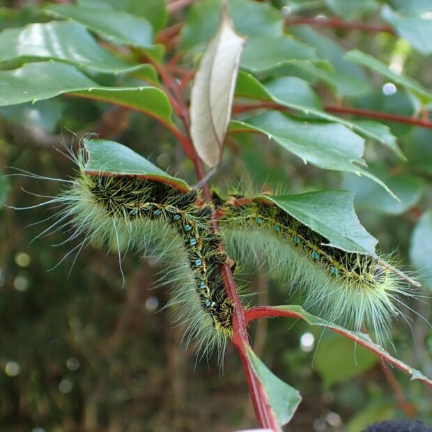 • 終齢幼虫(約10cm)。 白い長い毛と青い気門(呼吸のための穴)が目立ち迫力満点。 毒はない。
