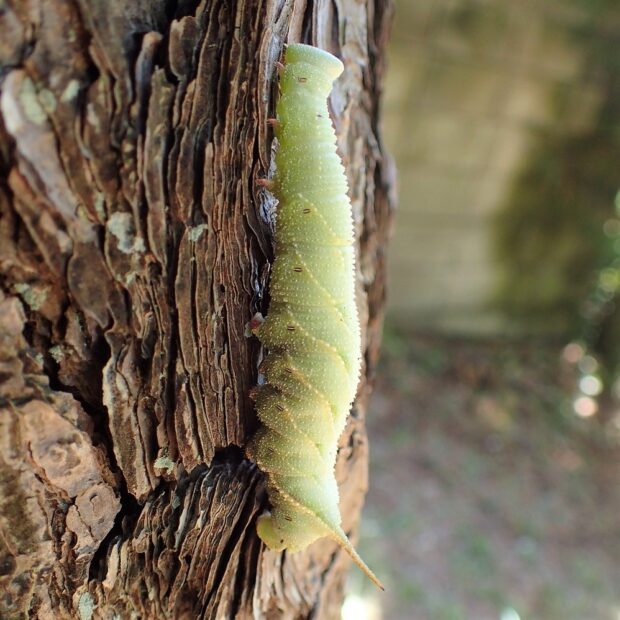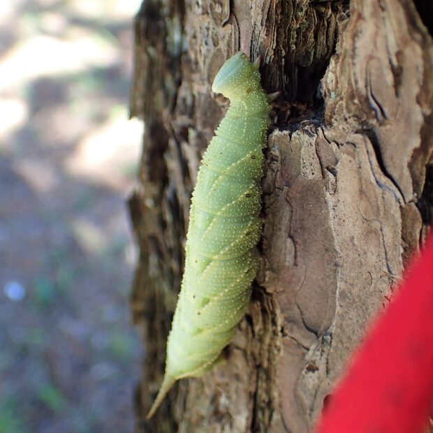 • おしりにしっぽのような尾角(びかく)がある幼虫。