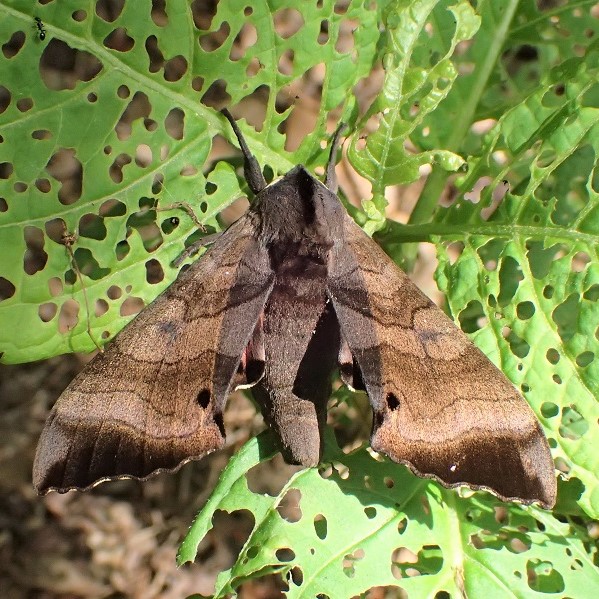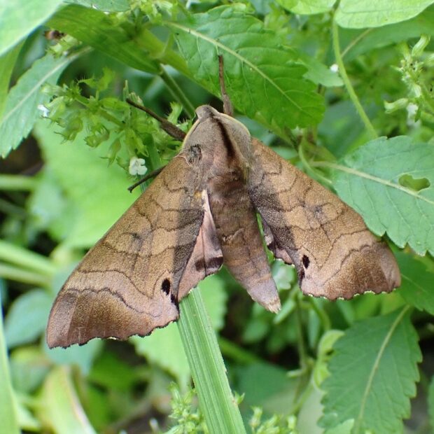 前ばねは波型模様で黒点があるスズメガの仲間。 後ばねは薄いピンク色をしています。 果樹園や雑木林周辺で見られます。