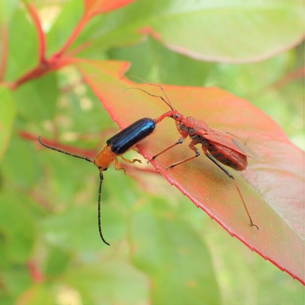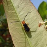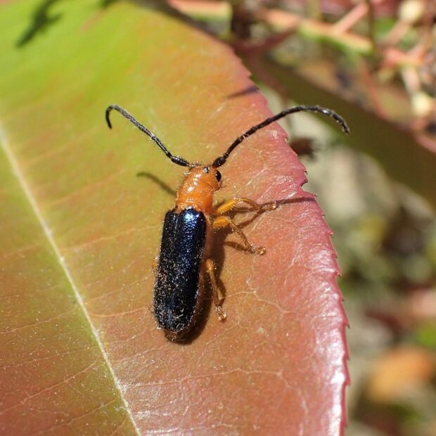 オレンジ色で、 はねがるり色の小さなカミキリムシ。 よく飛び、 葉の裏にぴたっととまります。 市街地のベニカナメモチ(レッドロビン)の生垣でも見られます。 複眼は触角のつけ根で分断され、 四つあるように見えます。 メスは枝にU字形の傷をつけて産卵します。