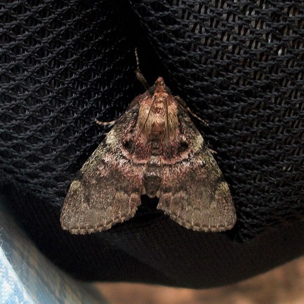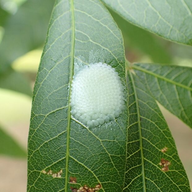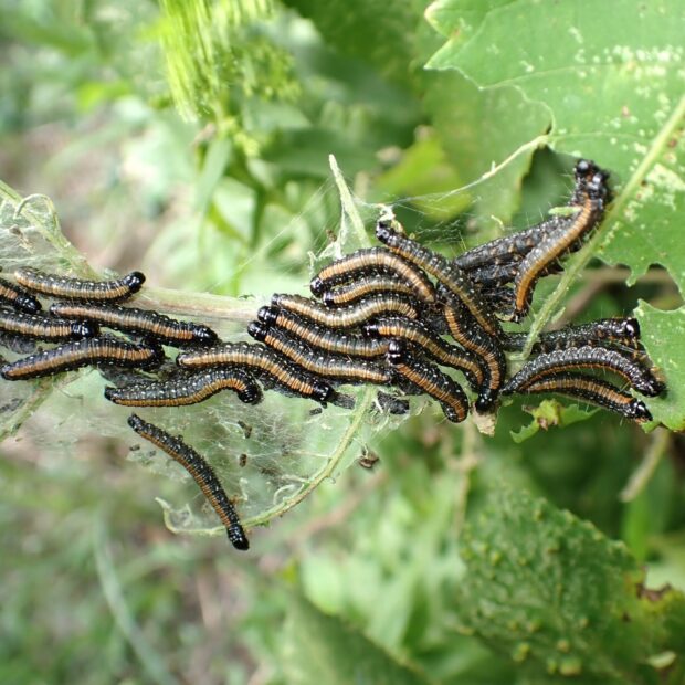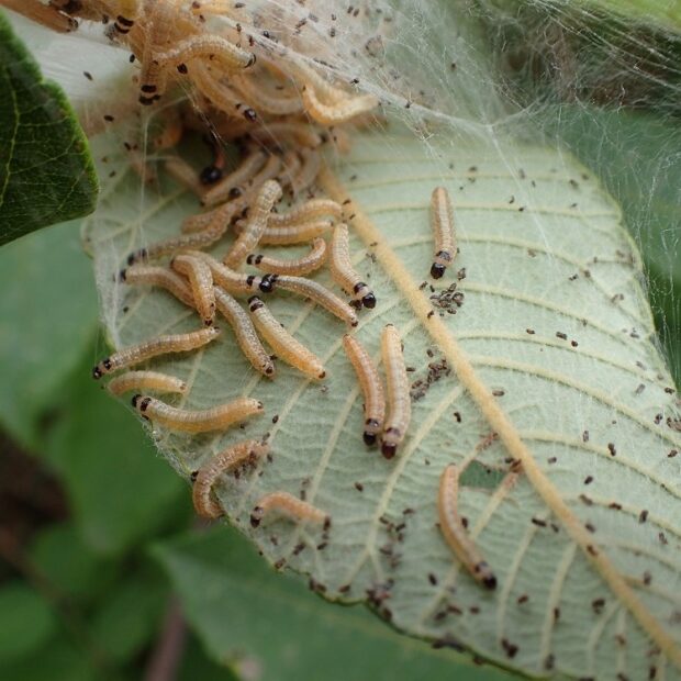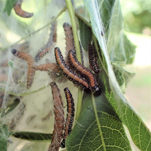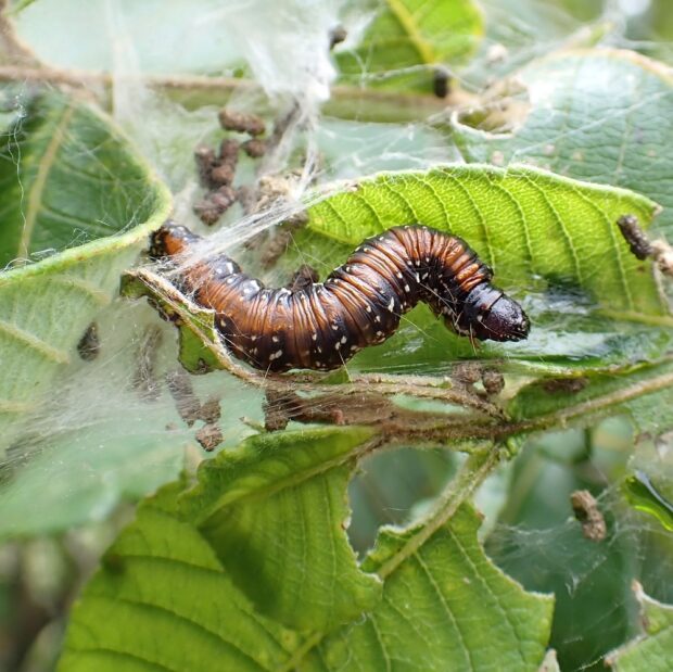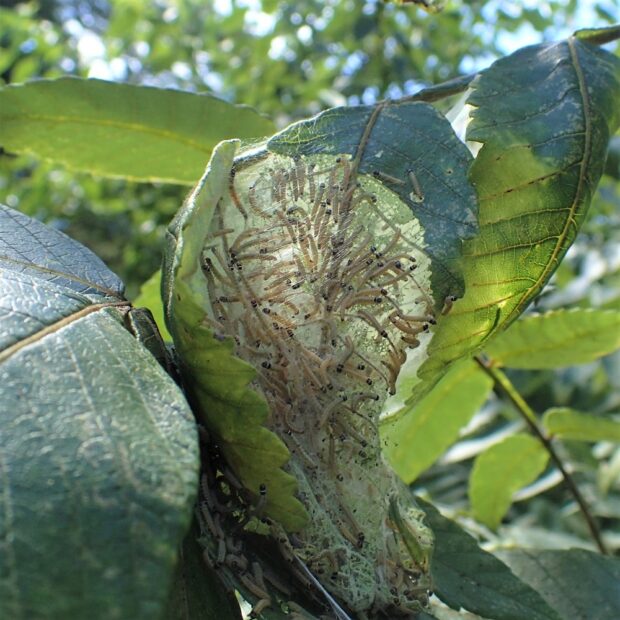 初夏に姿をあらわすガ。 夏、 幼虫は数枚の葉を糸でつつりあわせ、 大きな住みかを作ります。 その中で、 幼虫は集団になり葉を食べつくします。 幼虫は大きくなるとオレンジ色と黒の帯になり、 単独で行動します。 毒はありません。