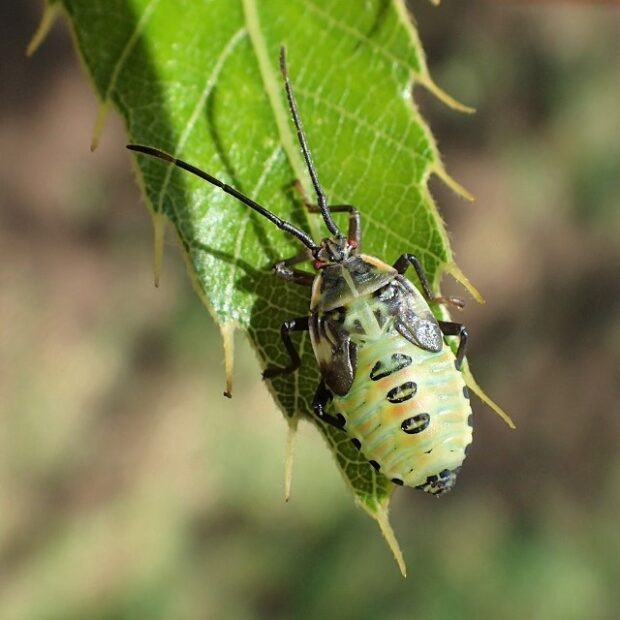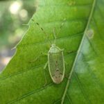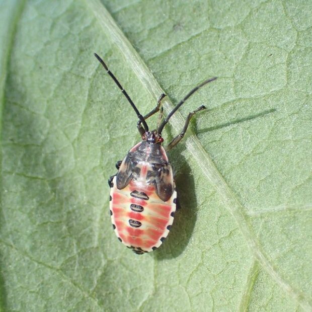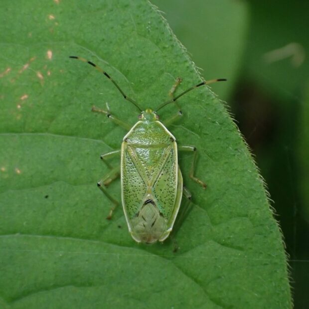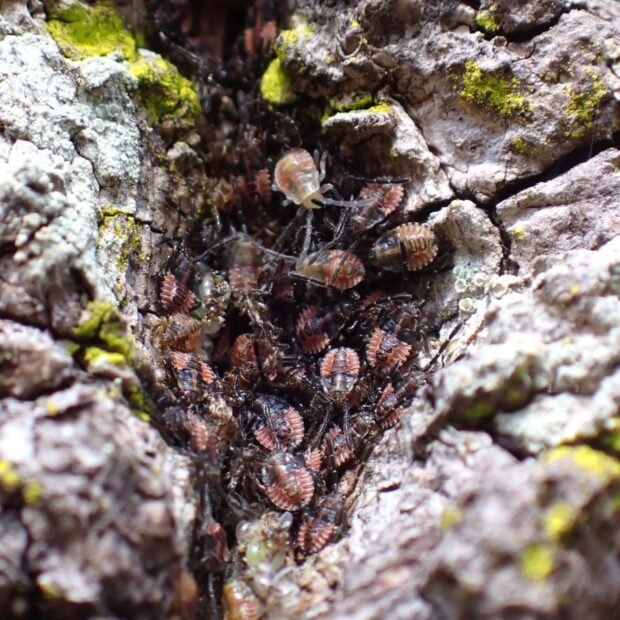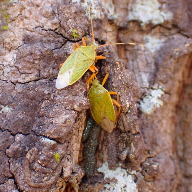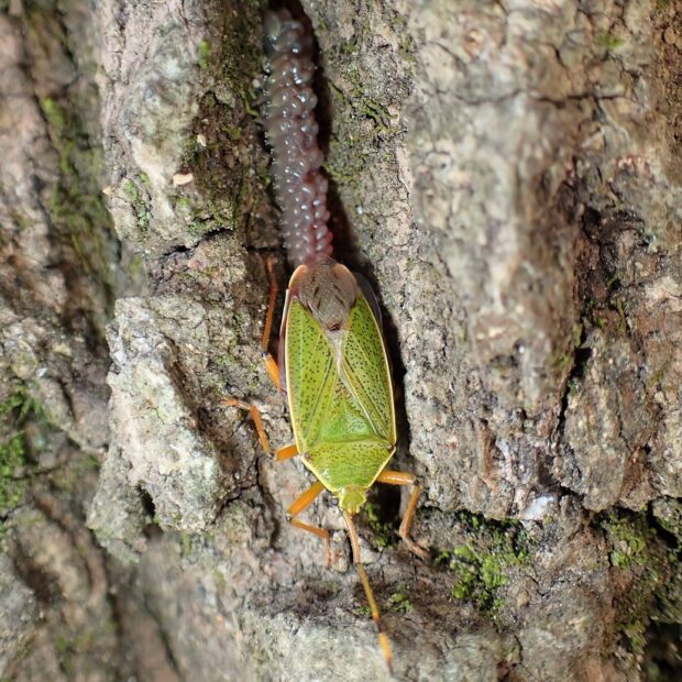 クヌギなどで見られるカメムシ。 気門(呼吸のため空気を体の中に取り入れる穴)が黒いのが特徴。 晩秋、 木の幹にひも状の卵のかたまりを産みつけます。 夏の頃は全身ほぼ緑色ですが、 冬が近づくと触角とあしが赤っぽくなります。