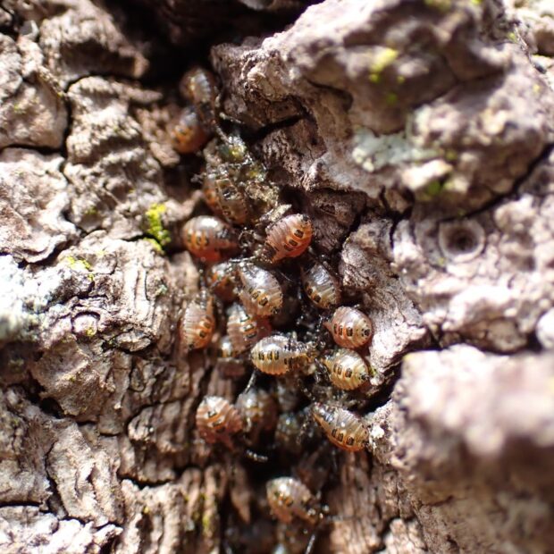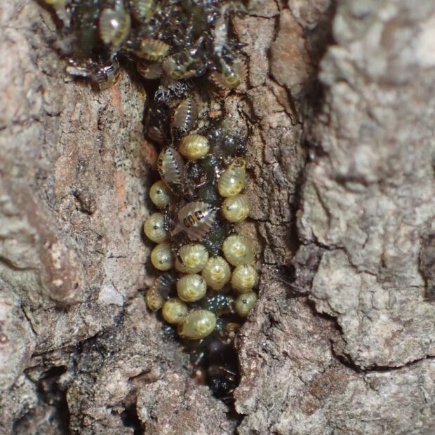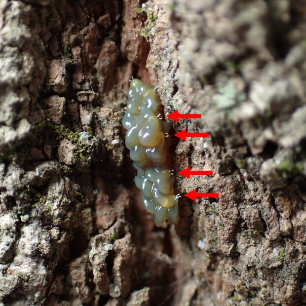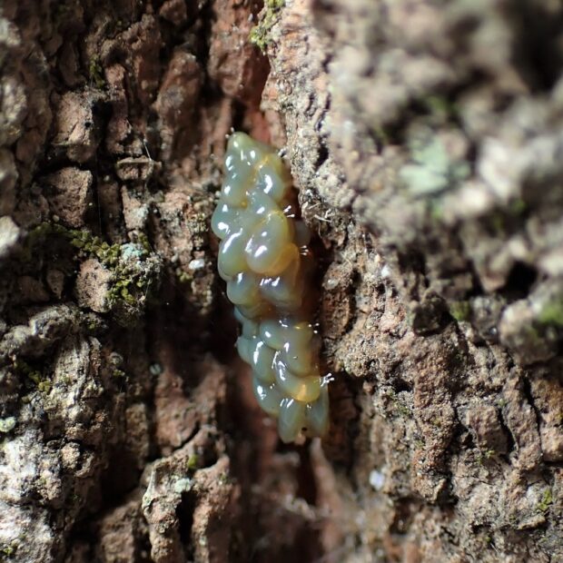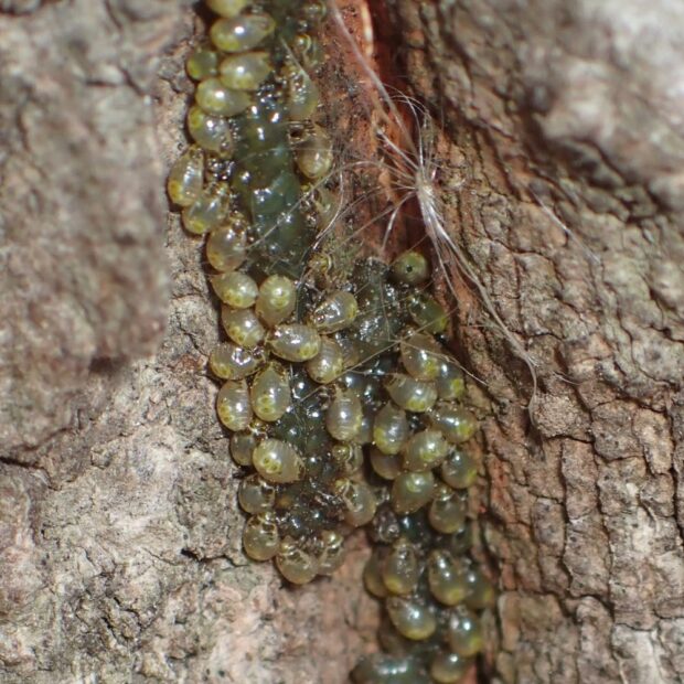 クヌギカメムシ類の卵はゼリーで覆われています。 冬にふ化する幼虫は、 3齢になるまでゼリーを食べて育ちます。 ゼリーには3齢まで育つ栄養分と、 幼虫の成長に必要な共生細菌が含まれています。 白い毛のようなものは呼吸菅です。