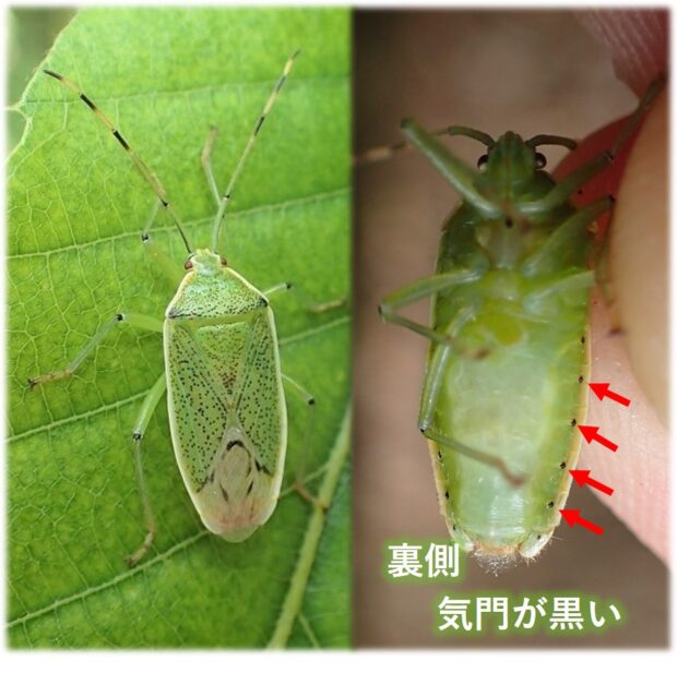 ヘラクヌギカメムシとサジクヌギカメムシは気門が黒くありません。 ヘラクヌギカメムシのオスの腹端はへら状、 サジクヌギカメムシのオスの腹端はさじ状(スプーン状)になっています。