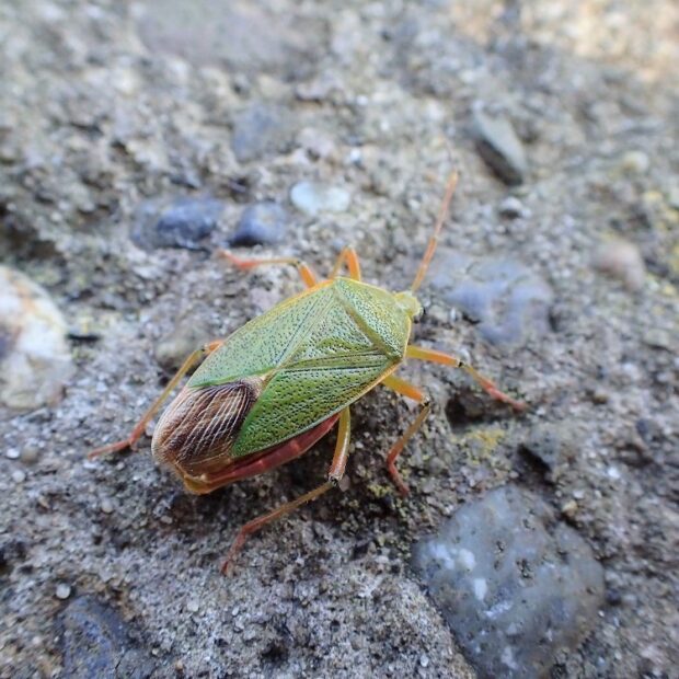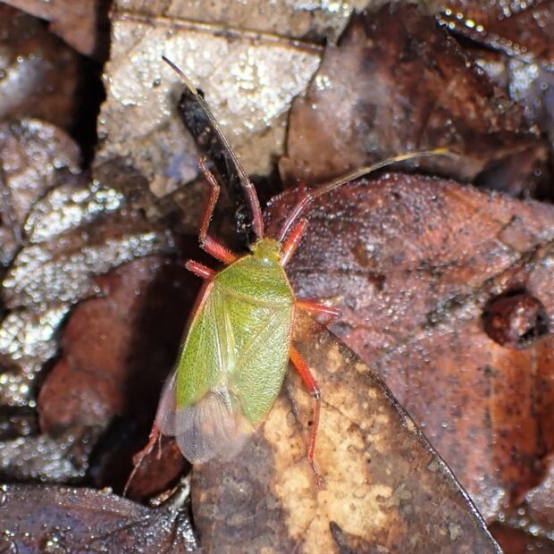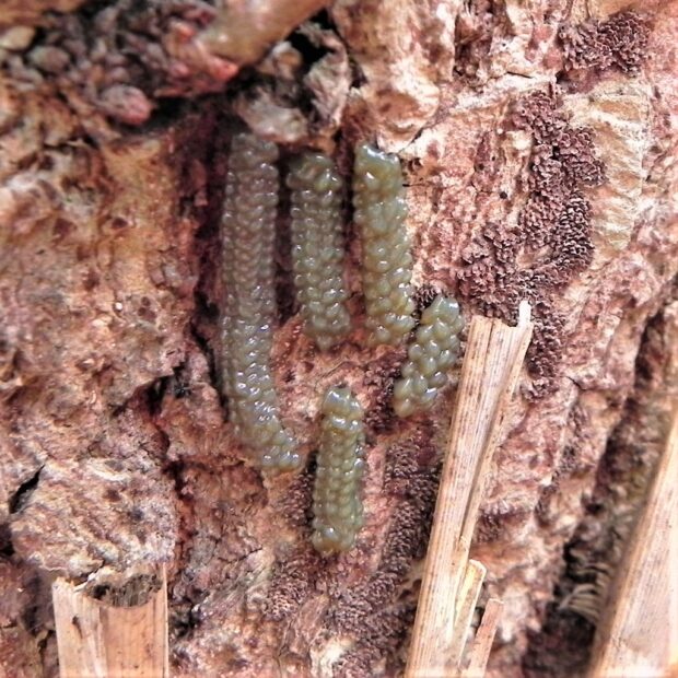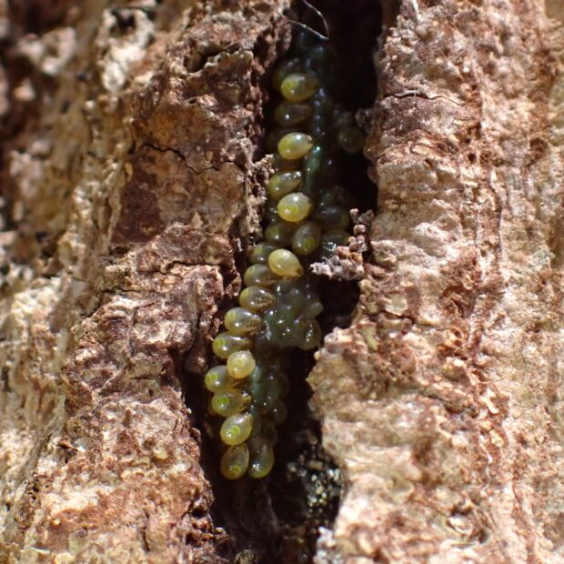 クヌギなどで見られる緑色のカメムシ。 メスは晩秋、 ひも状の卵のかたまりを幹に産みつけます。 卵のまわりはゼリーで包まれ、 春早くあらわれる幼虫のエサになります。 (MT)