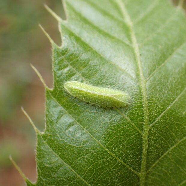 表ばねは黒っぽく、 裏ばねは灰色で黒い線が目立つシジミチョウ。 雑木林などで見られ、 日中はあまり飛ぶことはなく葉陰で休み、 早朝と夕方、 活発に飛びます。 卵で越冬。