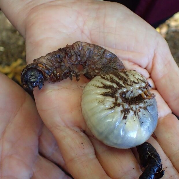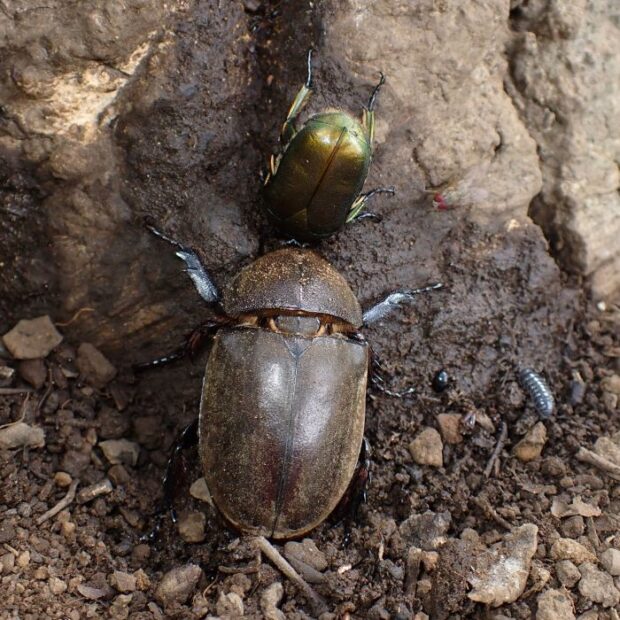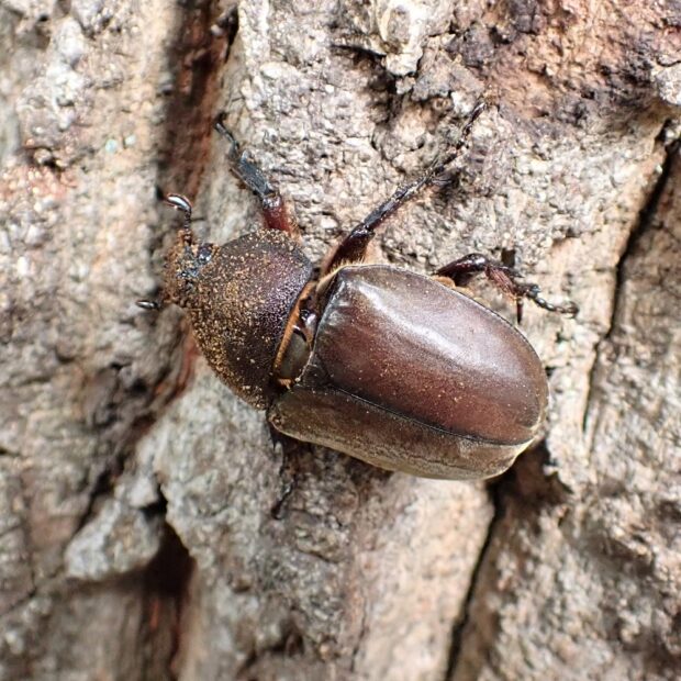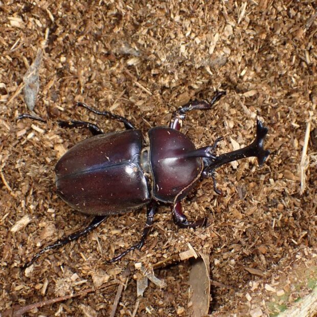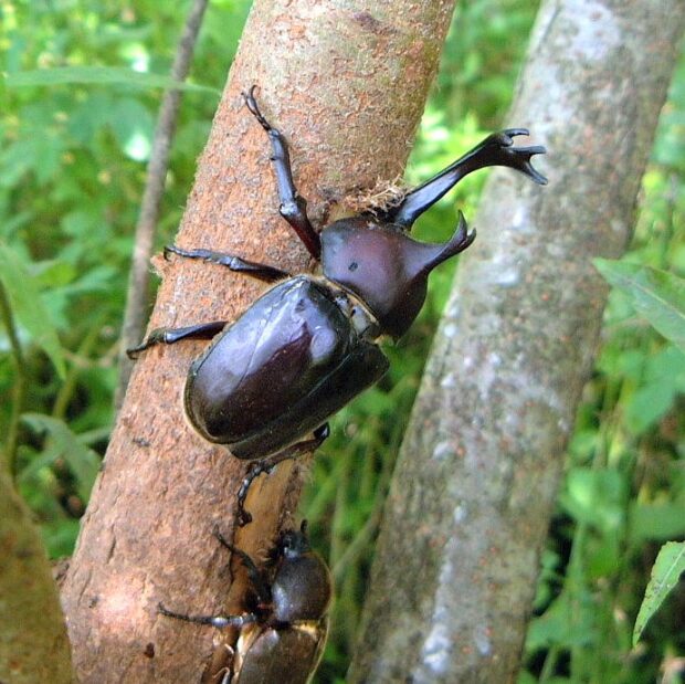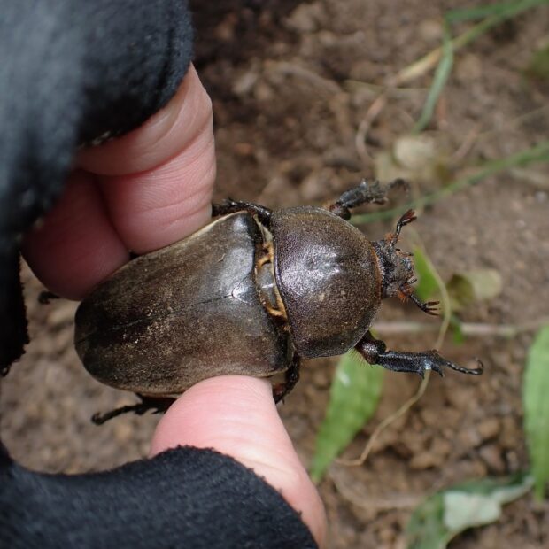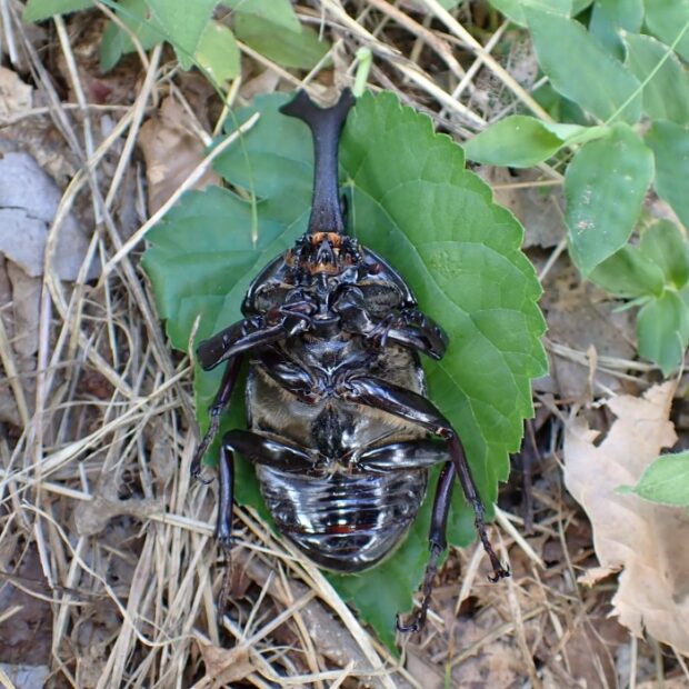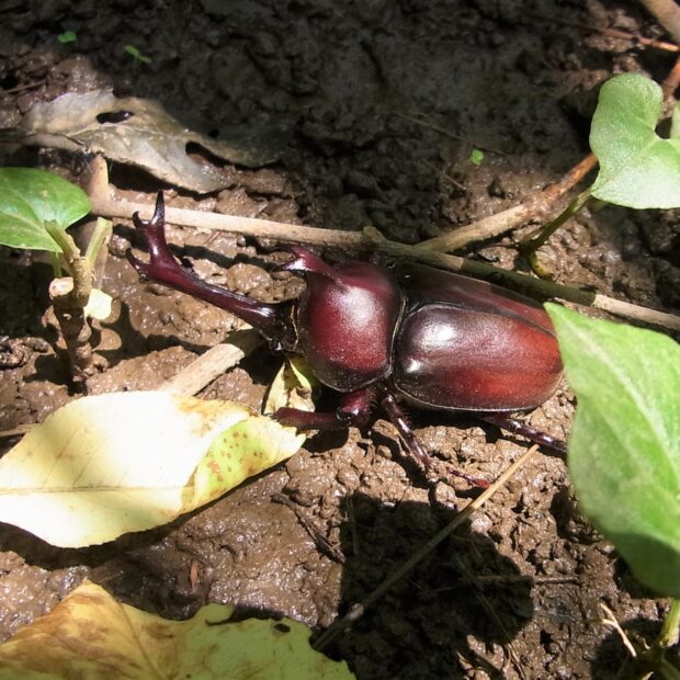コガネムシの仲間。 オスの頭には立派なツノがあり、 大きな体のオスのツノは大きく、 小さな体のオスのツノは小さいです。 ツノはエサ場やメスを奪い合う戦いで使います。 基本的には夜行性ですが、 日中もクヌギなどの樹液に集まります。