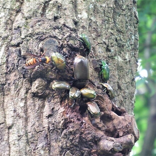 • 樹液酒場は大にぎわい。 カブトムシはどこにいるかな?他にどんな昆虫が来ているかな?