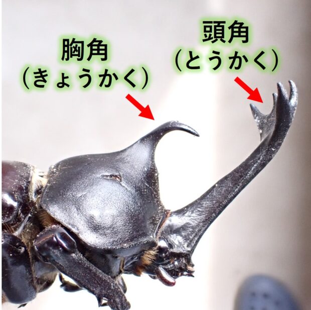 • 頭には大きなツノ、 胸には小さなツノがある。 大きなツノは二股に分かれ、 先端はY字になっている。