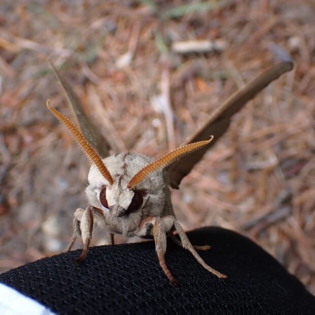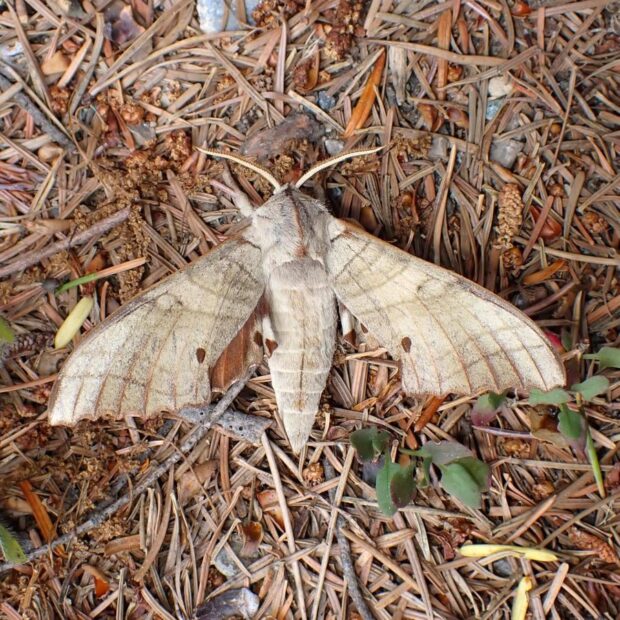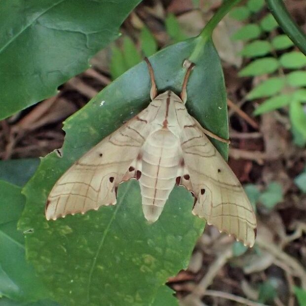 スズメガの仲間。 成虫は淡い褐色をしており、 頭からお腹の端までほっそりした縦線があります。 幼虫は緑色の大きなイモムシで、 スズメガの仲間としては珍しくブナ科の植物の葉を食べます。 蛹越冬。