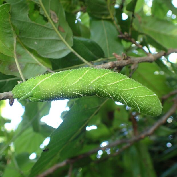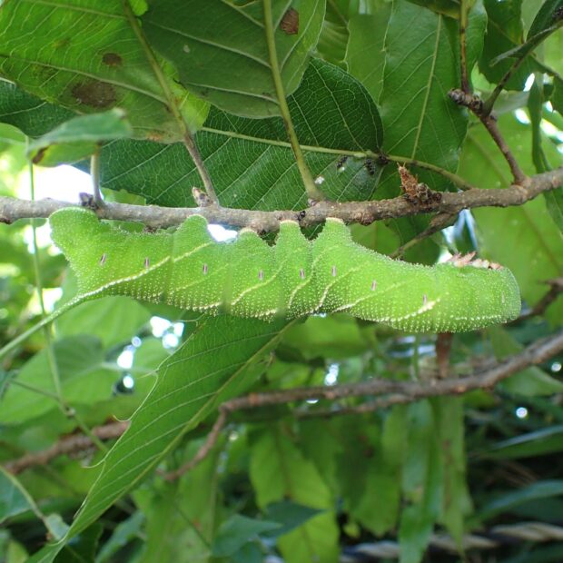 • 幼虫。 緑色の大きなイモムシ(約8cm)。