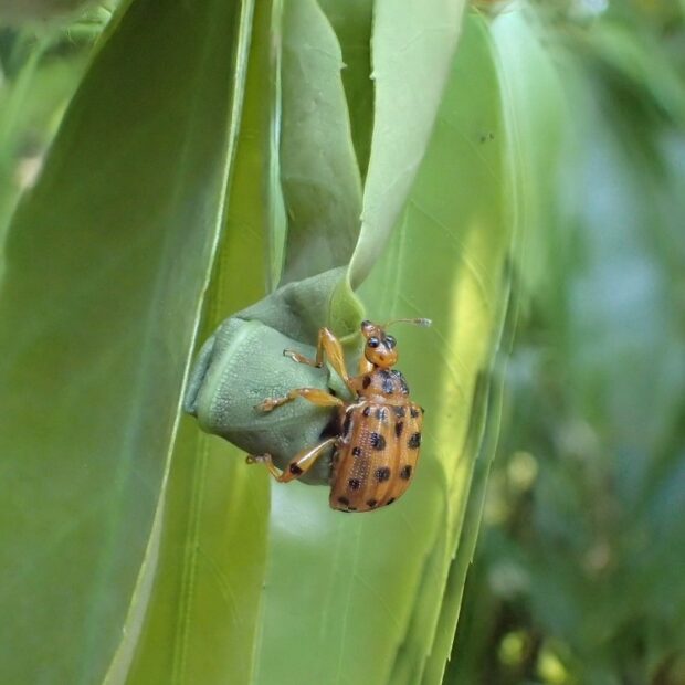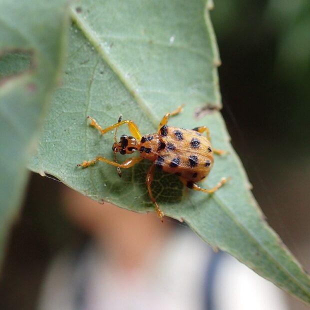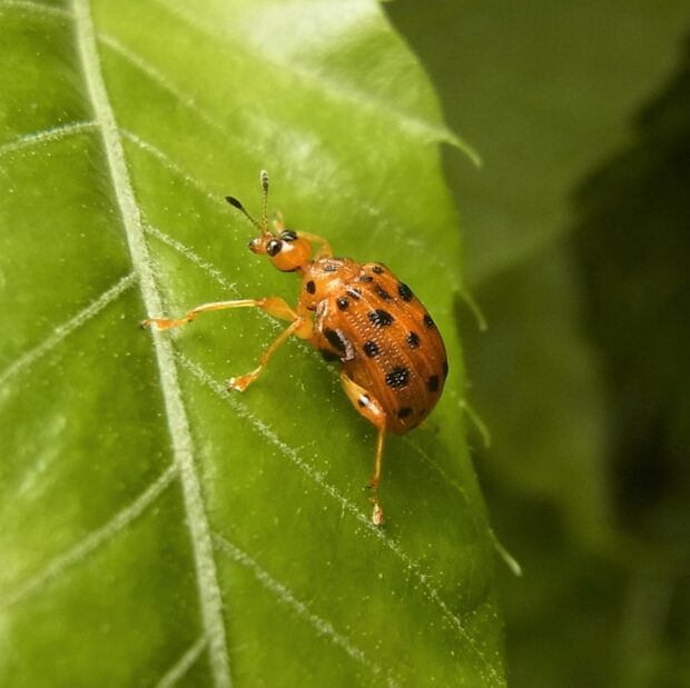 黄褐色の体に黒点を散りばめたドット柄のオシャレなオトシブミ。 クリ林などで普通に見られます。 メスは葉を巻いて中に産卵し、 幼虫は巻かれた葉のゆりかごの中で、 葉を食べて育ちます。 水玉模様にならず、 真っ黒になるものなど変異があります。