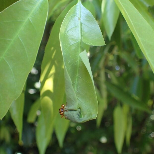 • メスが葉を巻き始めた。 中に卵を産む。 ゆりかごを作るのはメスの仕事。