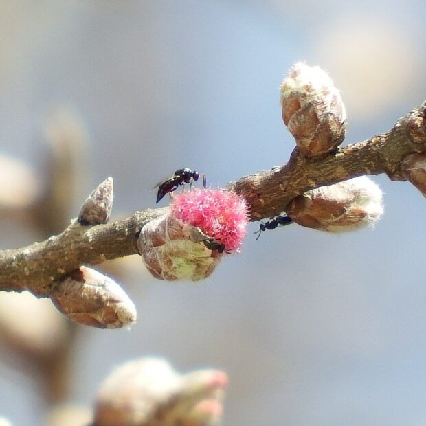 • クヌギハナカイメンフシ。 虫こぶの中の幼虫をねらって、 黒い寄生バチがやってきた。