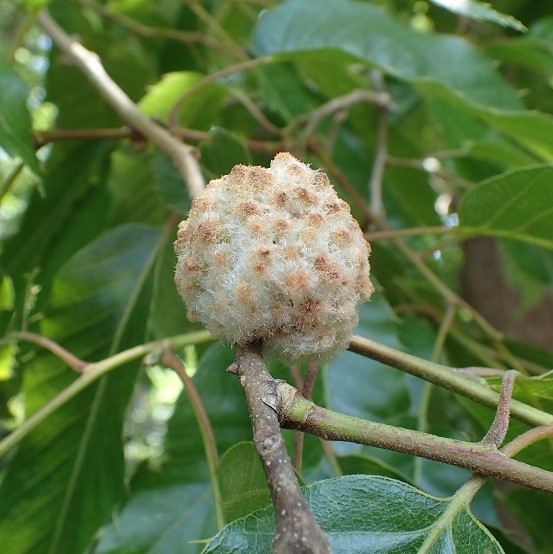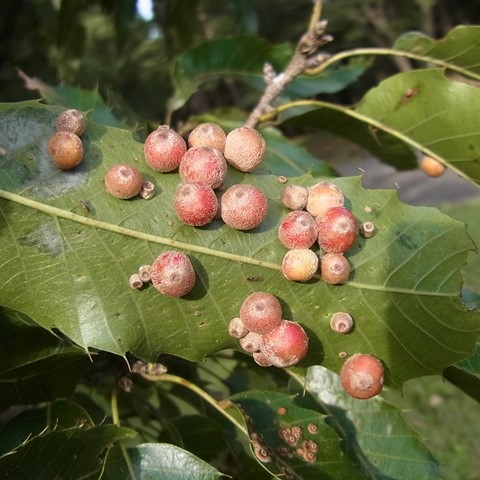 クヌギハケタマバチがクヌギに作った虫こぶ。 春、 ハチが花芽に産卵すると、 綿のようなフワフワの虫こぶになります(クヌギハナカイメンフシ)。 この虫こぶから、 6月頃羽化したハチは、 今度は葉の裏に産卵し、 丸い虫こぶをたくさん作ります(クヌギハケタマフシ)。