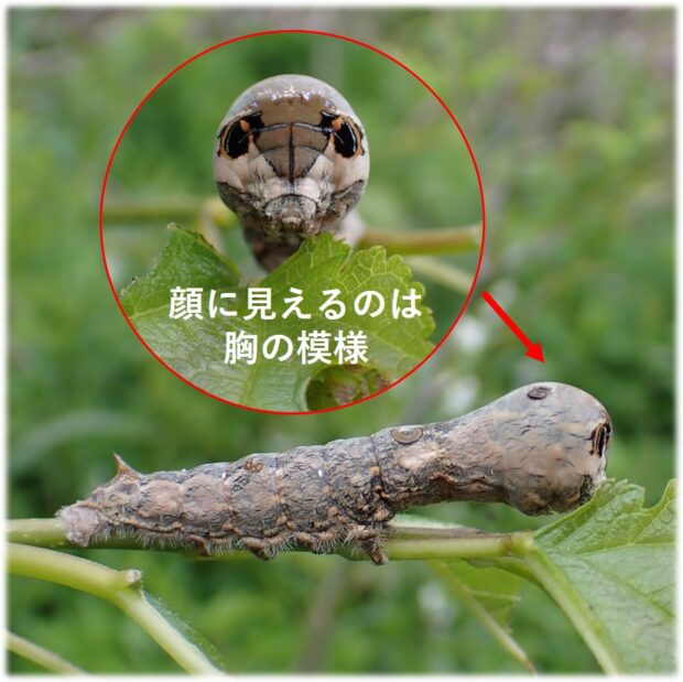 • 終齢幼虫(体長約35mm)。 体の前半分を前に突き出した姿勢でじっとしている。 木の枝にそっくり!