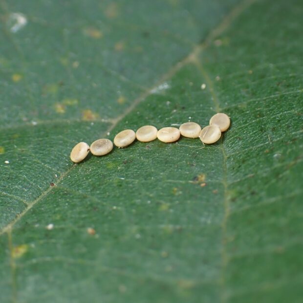 カイコガの仲間。 絹糸をつくるカイコは、 五千年以上前に、 中国でクワコを家畜化したと言われています。 カイコは飛べませんが、 クワコは飛ぶことができます。 繭は薄い黄色で、 糸をとることができます。