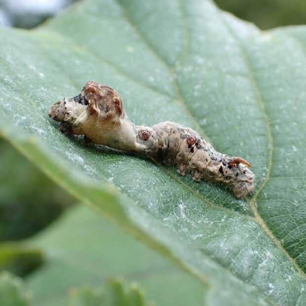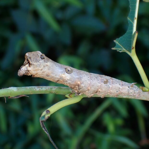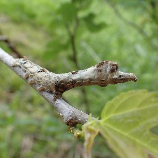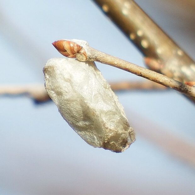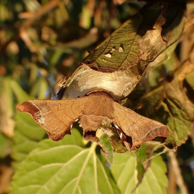 カイコガの仲間。 絹糸をつくるカイコは、 五千年以上前に、 中国でクワコを家畜化したと言われています。 カイコは飛べませんが、 クワコは飛ぶことができます。 繭は薄い黄色で、 糸をとることができます。