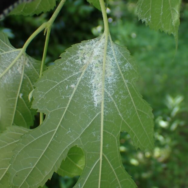 クワにつくキジラミ。 幼虫はお尻に糸のような白いロウ物質をつけて、 フワフワと綿のよう!幼虫は、 集団で葉の汁を吸い、 甘露(かんろ=糖分が多い液体)を出します。 成虫ははねがあり飛ぶことができます。
