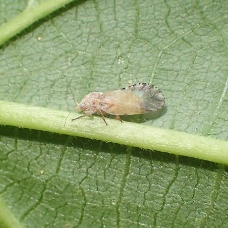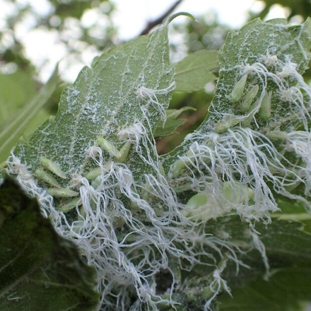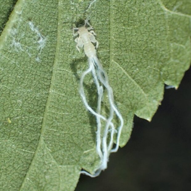 クワの葉裏の白い糸の集団は、 クワキジラミの幼虫です。 幼虫はお尻に糸のような白いロウ物質をつけて、 フワフワと綿のよう!幼虫は、 集団で葉の汁を吸い、 甘露(かんろ=糖分が多い液体)を出します。 成虫ははねがあり飛ぶことができます。 (MT)