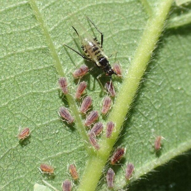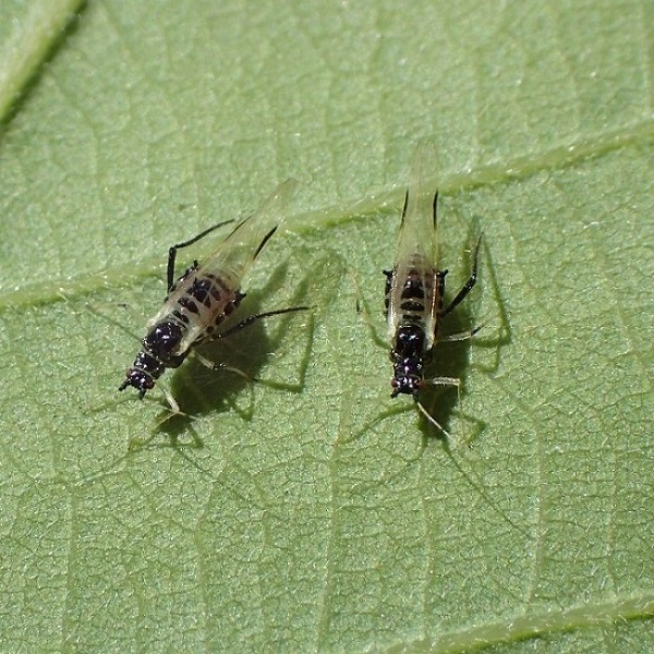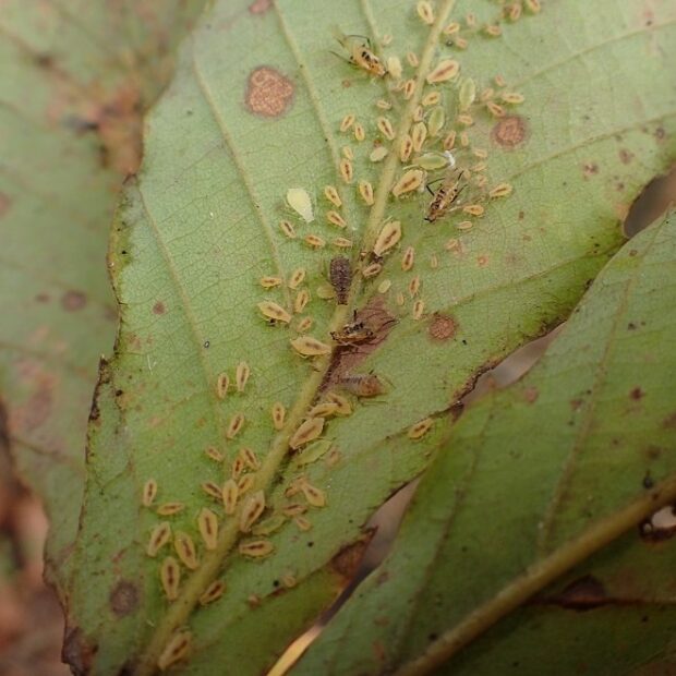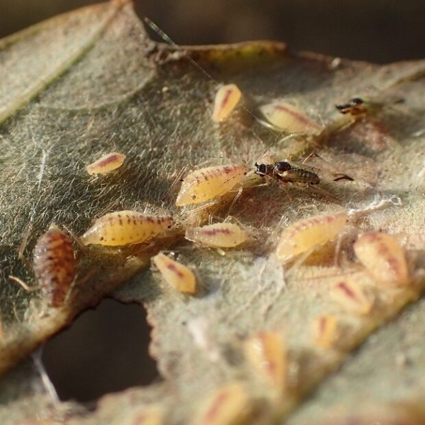 • 成虫と幼虫が集団生活。 葉脈に針のような口を刺し、 汁を吸っている。