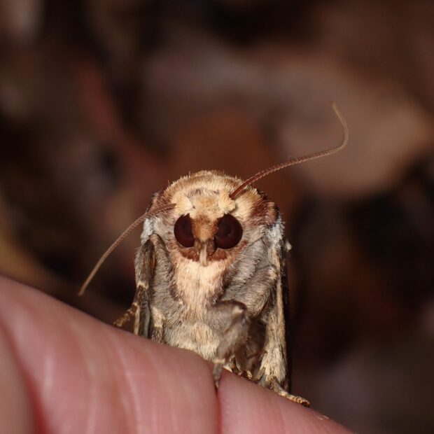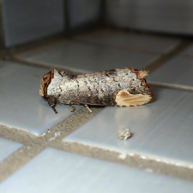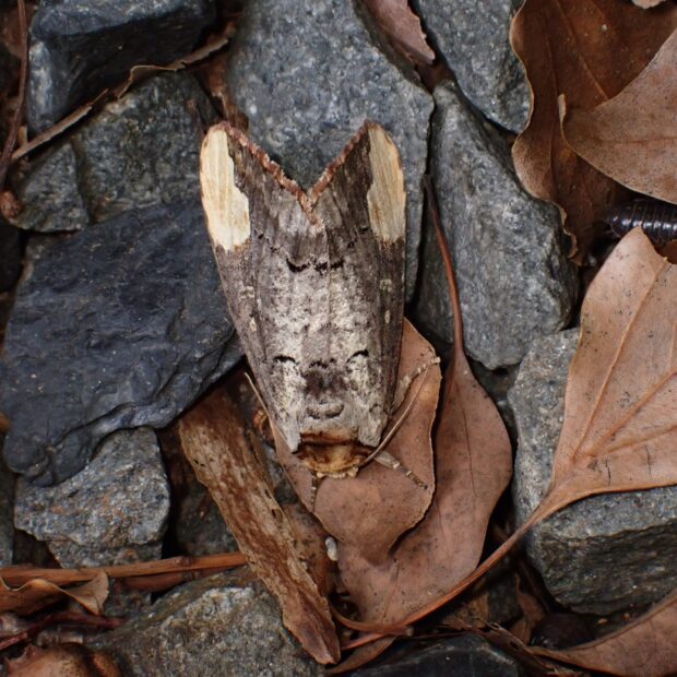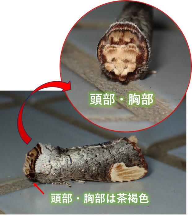 はねをたたむと、 かけた木の枝のように見えるシャチホコガの仲間。 似た仲間がいますが、 本種は前ばねのクリーム色の紋の内側が赤褐色であることが特徴。 幼虫の赤と黒のまだら模様はとても目立ちますが、 毒はありません。