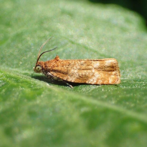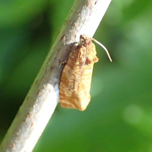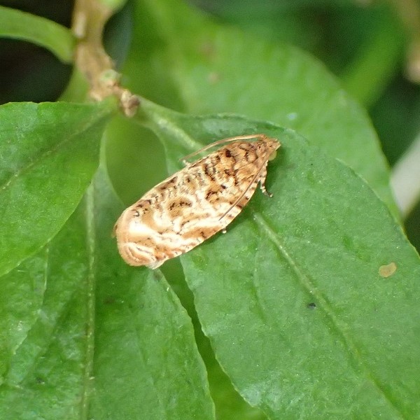 茶色のまだら模様の小さなヒメハマキ。 幼虫はコブシなどモクレンの仲間の葉を2枚重ねて、 中を食べます。 (MT)