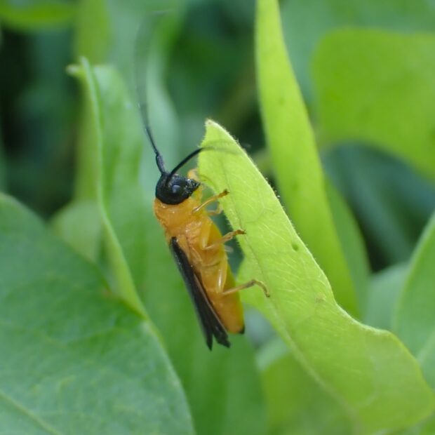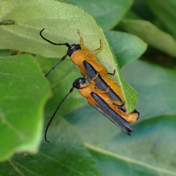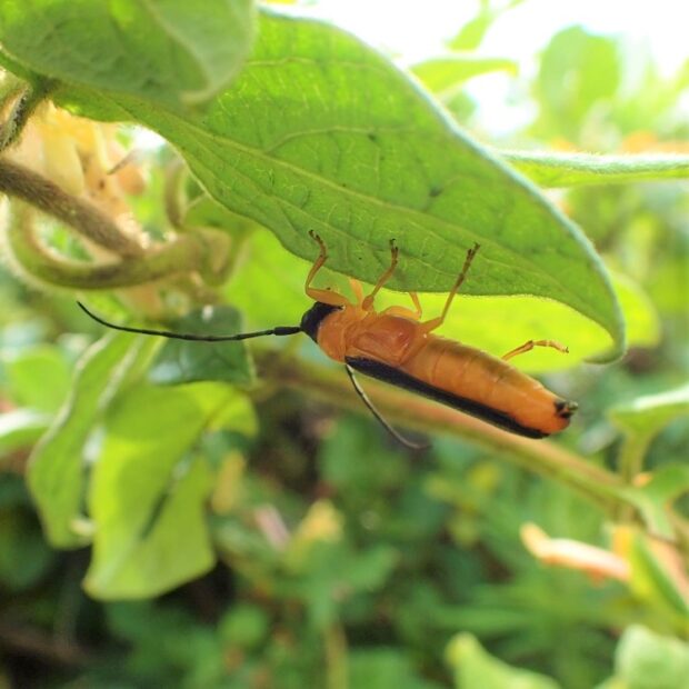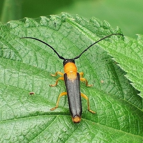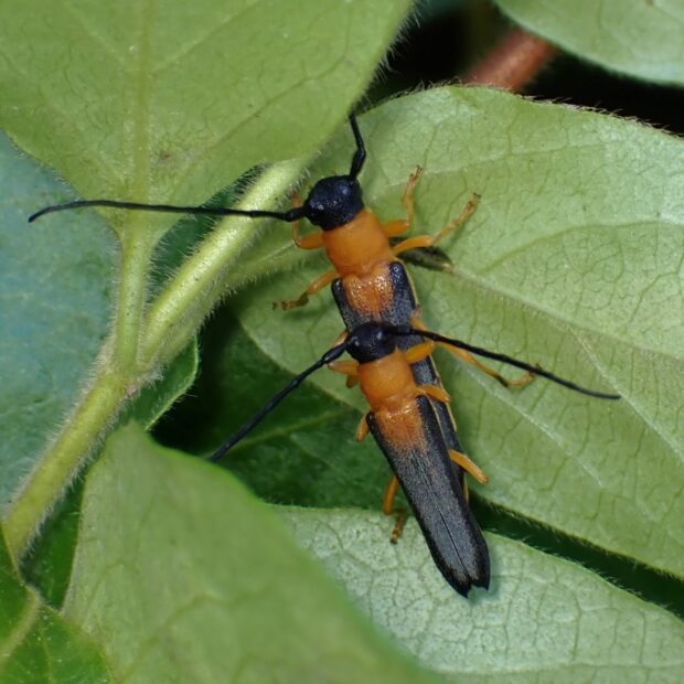 黒い頭にオレンジ色の胸が目立つカミキリムシ。 リンゴカミキリの仲間の中では大きくどっしりしています。 スイカズラに普通にいます。 上翅(じょうし)の黒いふちどりにも注目。 「シラハタ」とは昆虫学者の白畑幸太郎さんのお名前からつけられました。