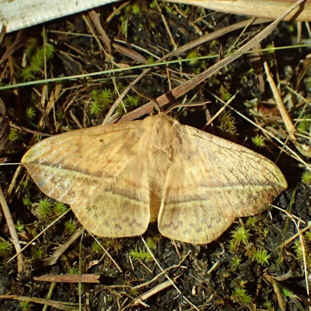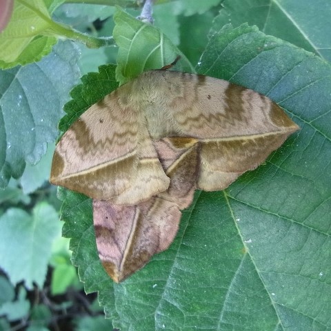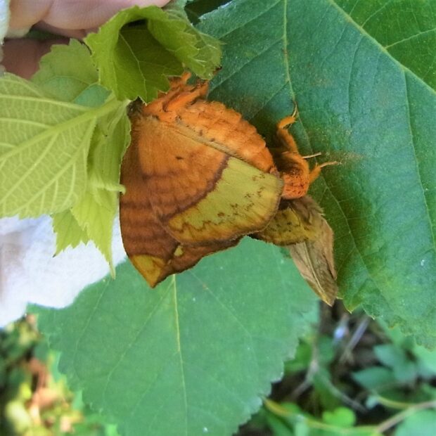 はねに丸みがあり、 線が1本とおっているガ。 幼虫は長い毛がある毛虫で、 警戒すると、 体の前を持ち上げて左右に激しくふって、 威嚇します。 幼虫に毒はありません。 国内では唯一のオビガ科のガです。 (MT)