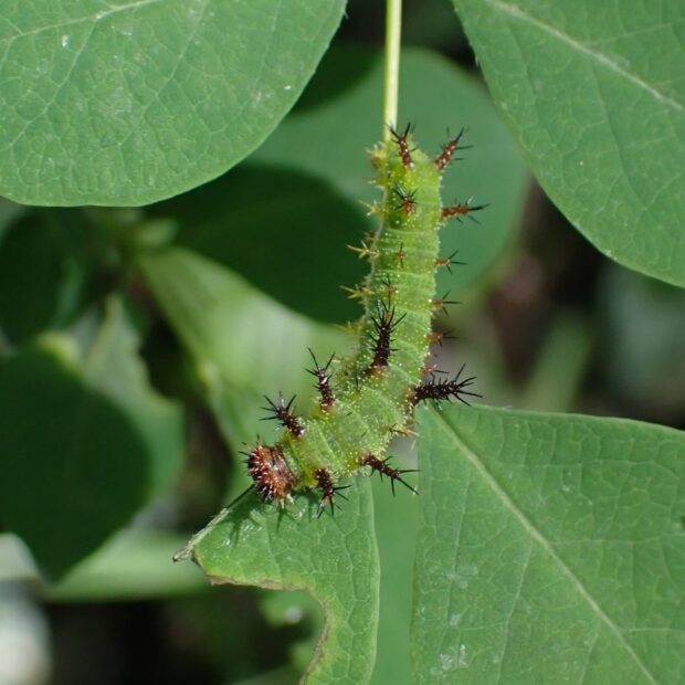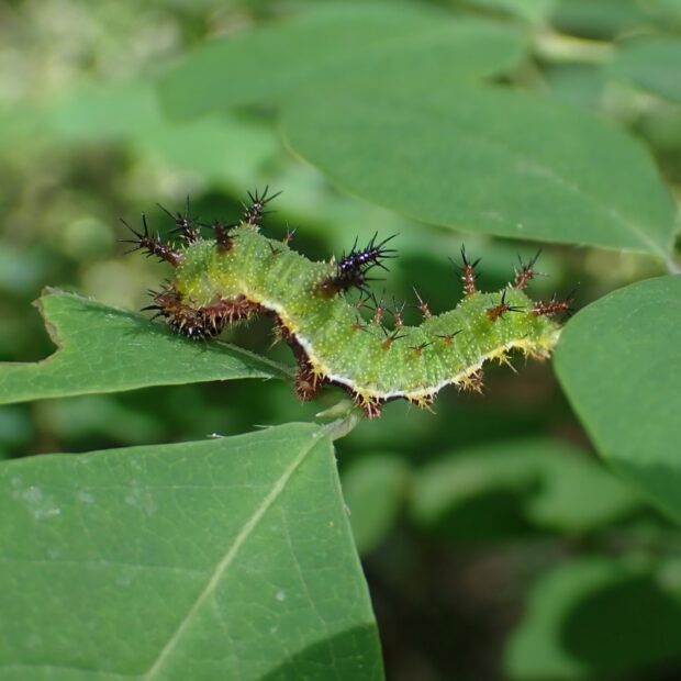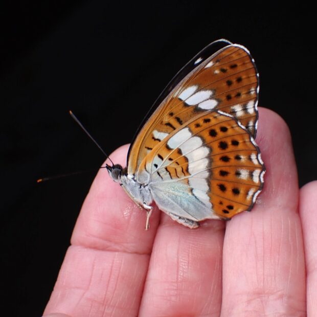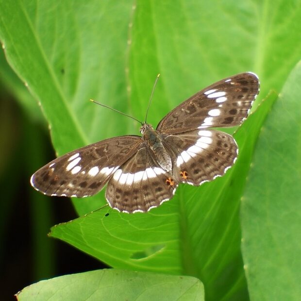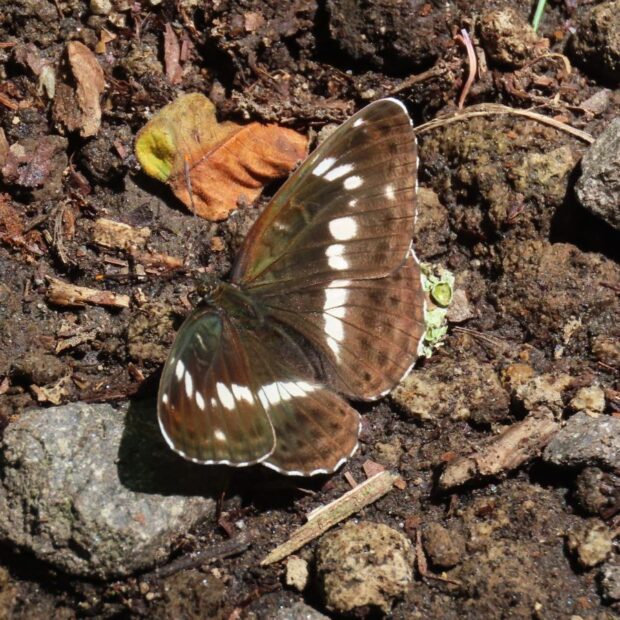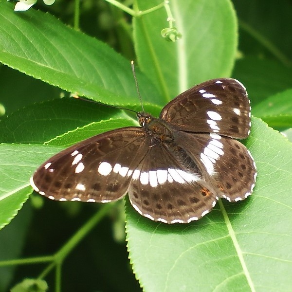 こげ茶色のはねに白い一文字模様を持つタテハチョウ。 滑空は行わず普通に羽ばたいて飛びます。 ふ化したばかりの1齢幼虫は葉先を食べて、 主脈にフンを糸で継ぎ足し長く伸ばします。 雑木林や渓流沿いで見られます。