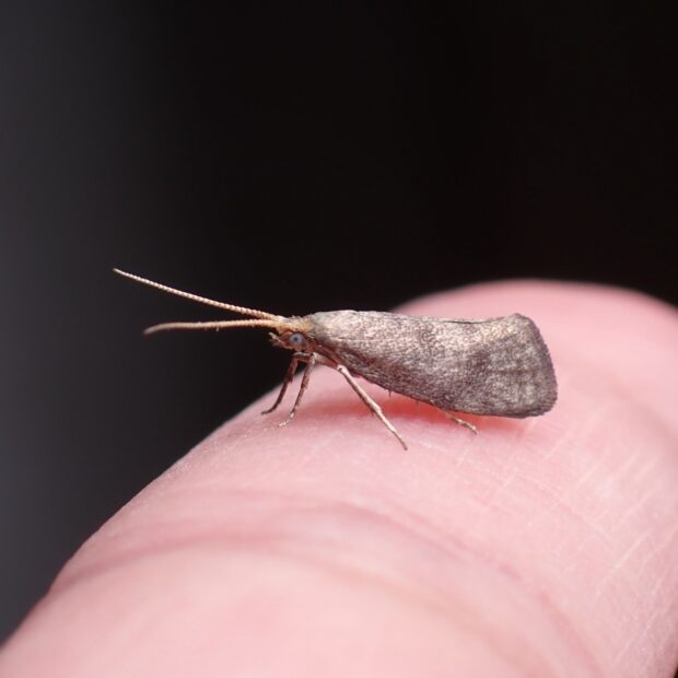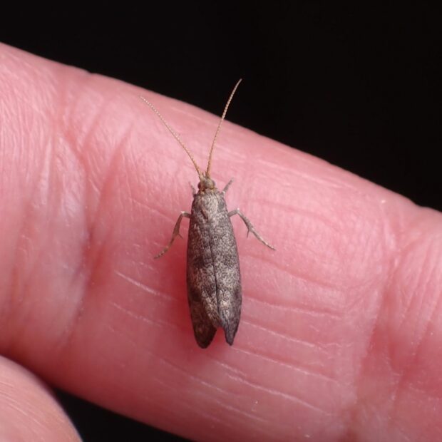 春~初夏にあらわれる小さなガ。 幼虫は早春にスイカズラの新芽を食べます。 繭はおもしろく、 突起が2つ並んでいます。